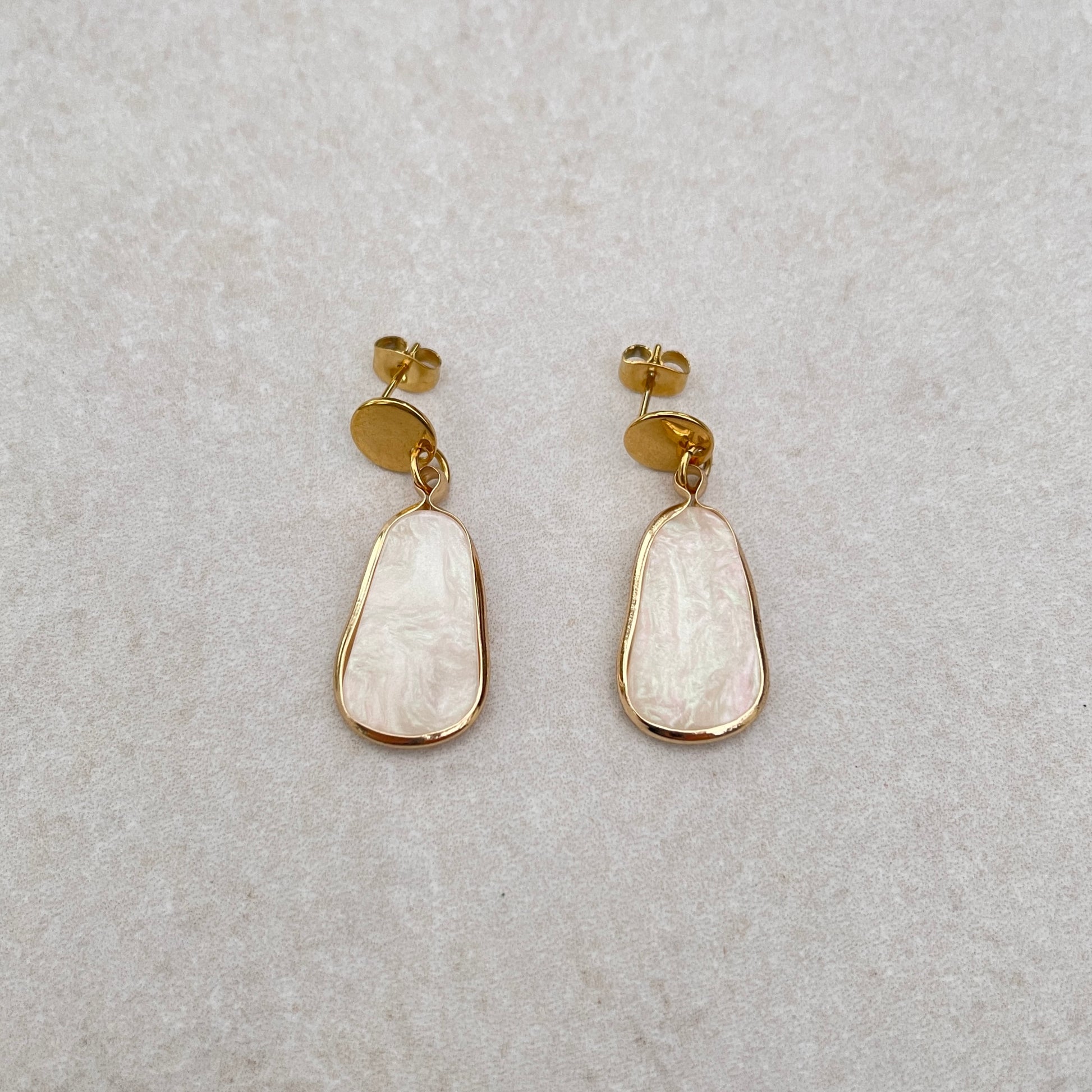 Yanbu sind schöne handgemachte Ohrstecker mit einem Goldplättchen und Perlmutt-Anhänger.